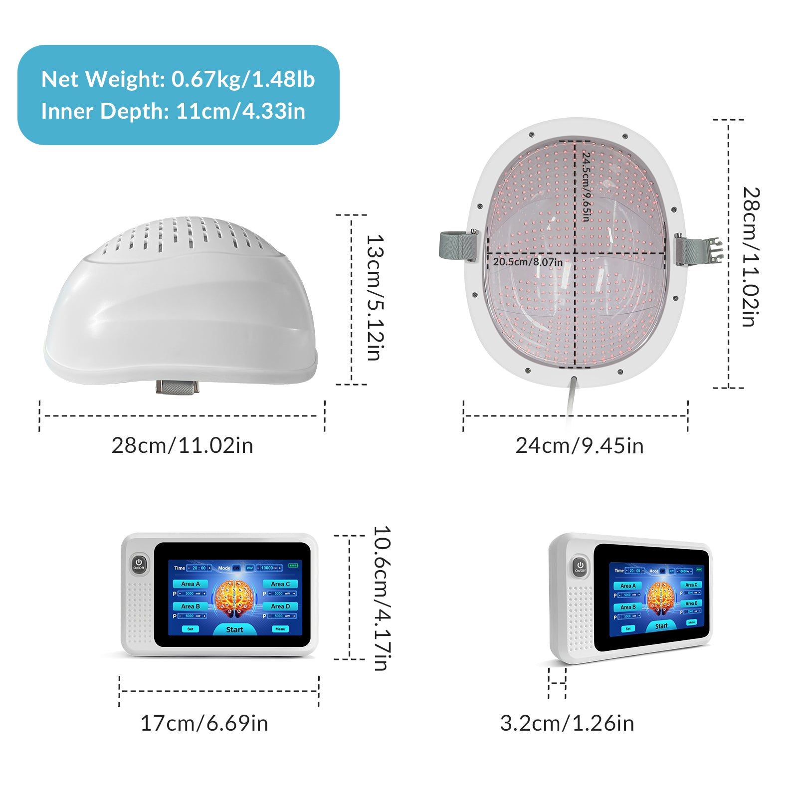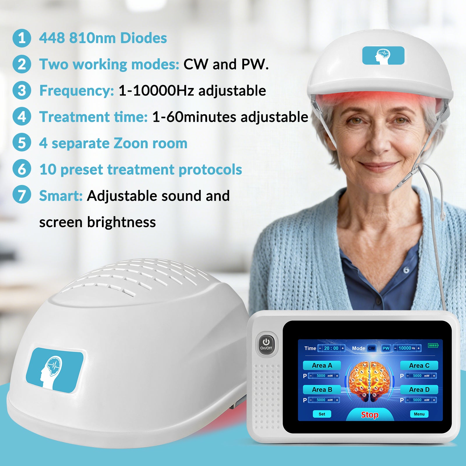 • CUSTOMIZABLE MODES – SAFE & EASY TO USE: The near-infrared phototherapy helmet features a fully customizable design, delivering a professional-grade experience tailored to each user's individual needs and health goals. The device precisely regulates light intensity, frequency, and duration to ensure optimal efficacy while prioritizing maximum comfort and safety. The helmet supports both continuous and pulsed light modes, with pulsed frequencies flexibly adjustable between 1Hz and 10,000Hz. Single-session duration can be customized from 1 to 60 minutes. Volume control and screen brightness adjustment further enhance usability and user experience. It also features 4 separate Zoon room and ten preset protocols, providing versatile experimental support for diverse studies related to neurological and cognitive functions.